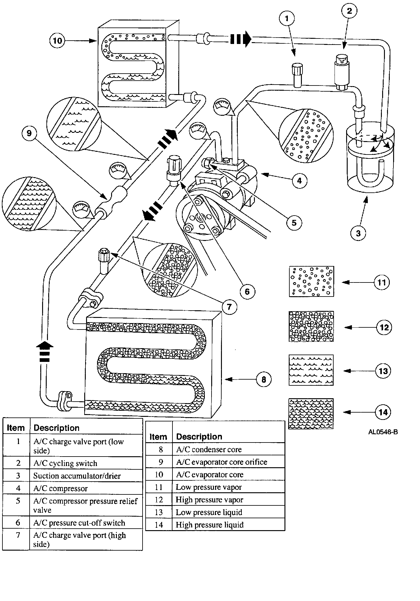The A/C condenser core, being close to ambient temperature, causes the refrigerant vapor to condense into a liquid when heat is removed from the refrigerant by ambient air passing over the fins and tubing. The now liquid refrigerant, still at high pressure, exits from the bottom of the A/C condenser core and enters the inlet side of the A/C evaporator core orifice.