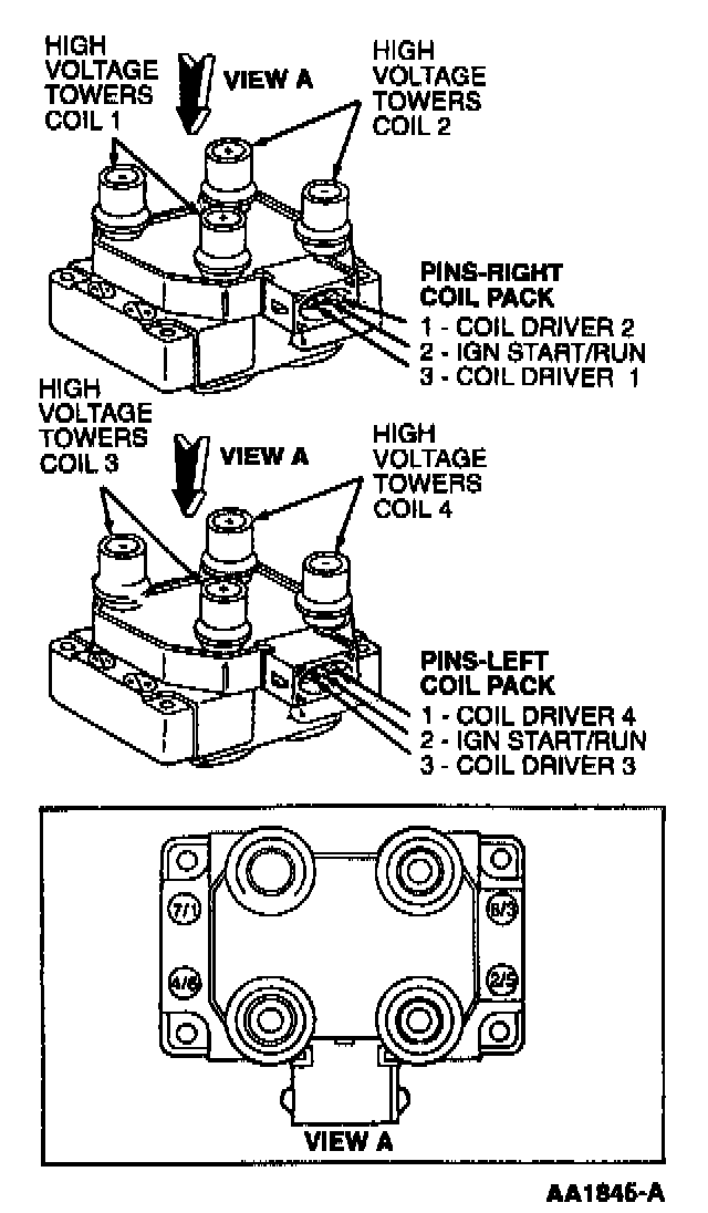 Coil packs come in four tower, six tower vertical connector, and six-tower horizontal connector models. Two adjacent coil towers share a common coil and are called a matched pair. For six-tower coil pack (six cylinder) applications the matched pairs are 1 and 5, 2 and 6, and 3 and 4. For dual four-tower coil pack (eight cylinder) applications the matched pairs are 1 and 6, 3 and 5, 4 and 7, and 2 and 8. For four-tower coil pack (four cylinder) applications the matched pairs are 1 and 4, and 2 and 3.