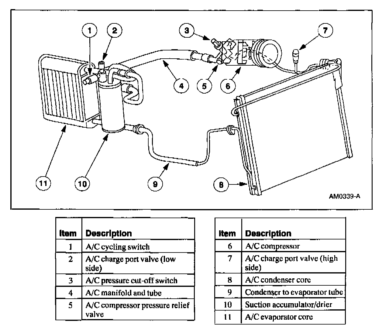 The A/C refrigerant system is a clutch cycling orifice tube type. The system components are: