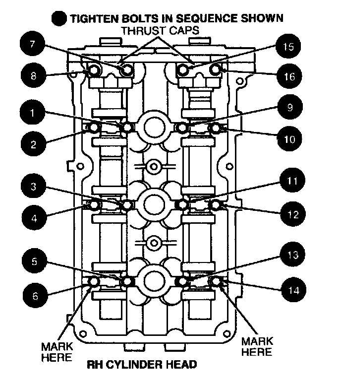 With RH cylinder head rocker arms installed, align RH cylinder head camshaft end play using thrust caps as reference. Then tighten RH cylinder head camshaft journal cap bolts in sequence shown to 8-12 Nm (71-106 inch lbs.) leaving thrust caps loose.