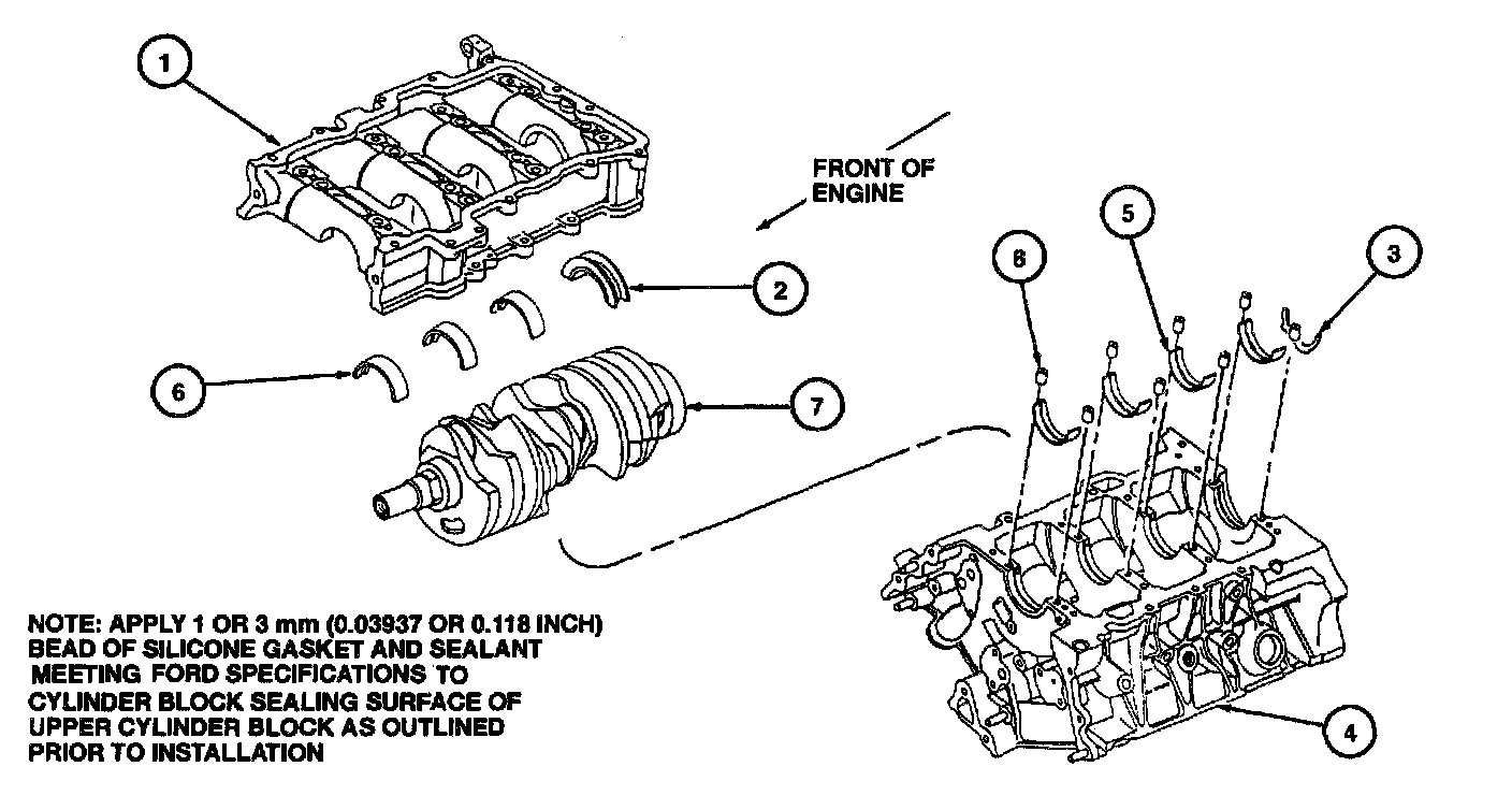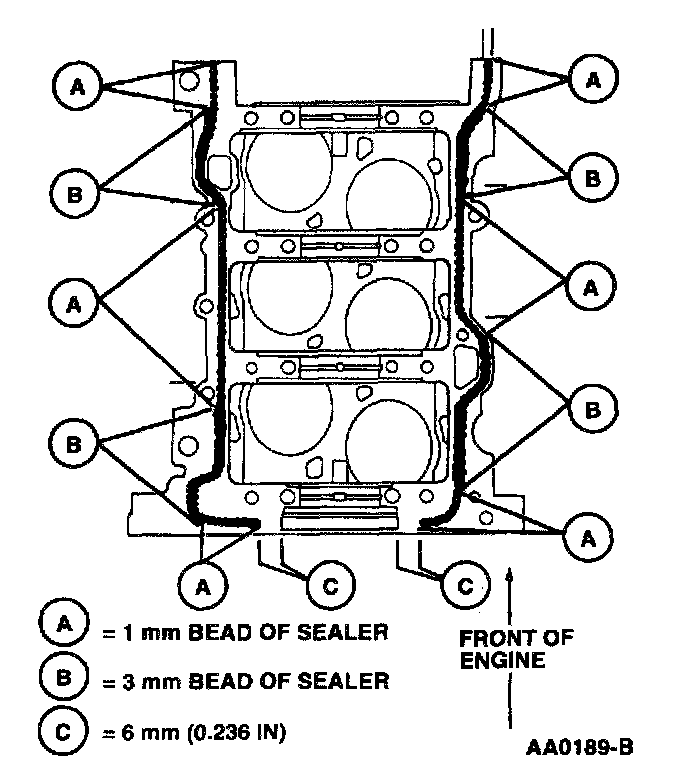 Apply a 1 mm (0.03937 inch) bead of Silicone Gasket and Sealant F7AZ-19554-EA or equivalent meeting Ford specification WSK-IVI2G343-A4 to lower cylinder block sealing surface of cylinder block and a 3 mm (0.118 inch) bead at grooves as illustrated.