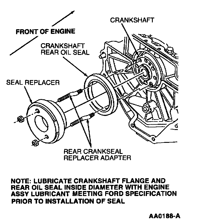 19. NOTE: Lubricate crankshaft flange and crankshaft rear oil seal inside diameter with Engine Assembly Lubricant D9AZ-19579-D or equivalent meeting Ford specification ESR-M99C80-A prior to installation of crankshaft rear oil seal.