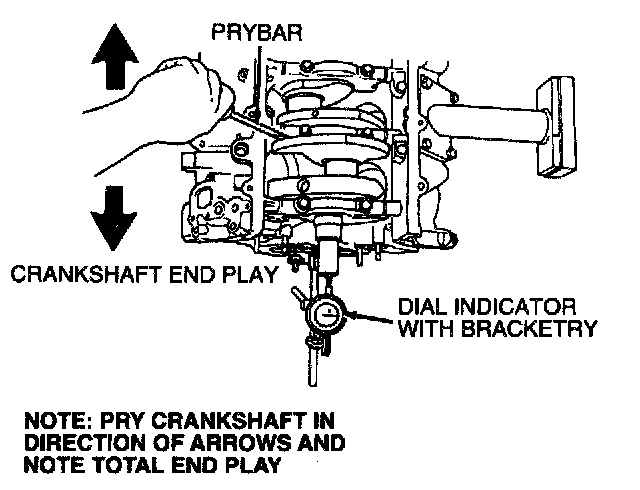 Check crankshaft end play in both directions as shown using Dial Indicator with Bracketry 100-002 (TOOL-4201-C) or equivalent.