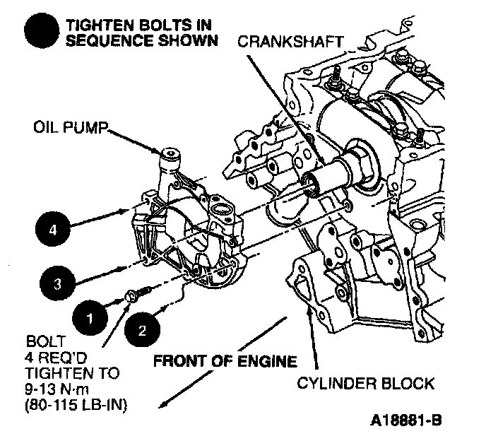 30. Install oil pump retaining bolts and tighten in sequence to 8-12 Nm (71-106 inch lbs.)