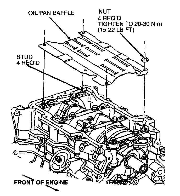 31. Install oil pan baffle and retaining nuts. Tighten nuts to 20-30 Nm (15-22 ft. lbs.)