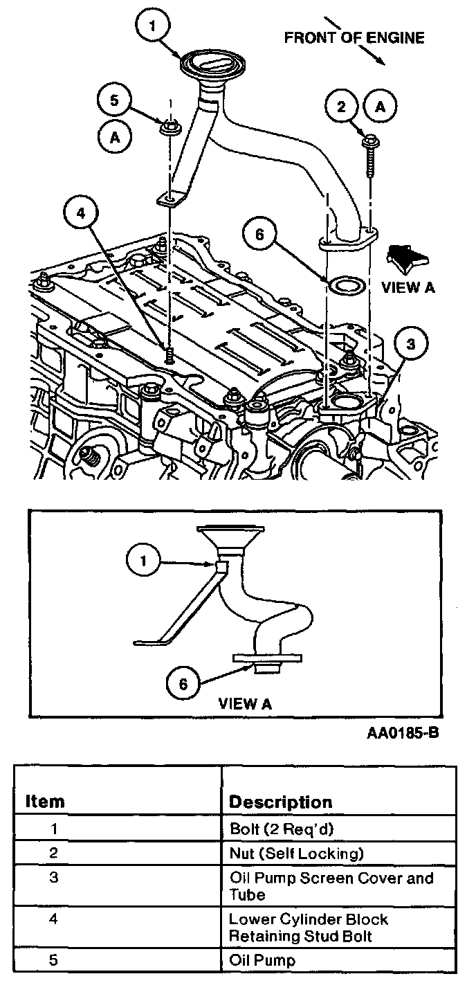 33. Install new self-locking oil pump screen cover and tube support nut to lower cylinder block retaining stud bolt. Tighten nut to 8-12 Nm (71-106 inch lbs.)