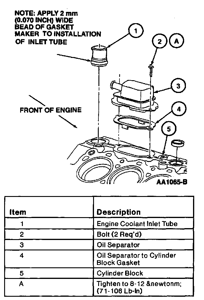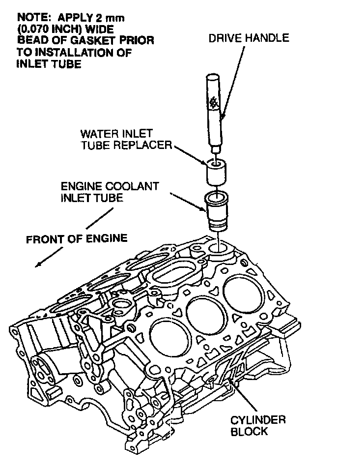35. If removed install engine coolant inlet tube into cylinder block with a Water Inlet Tube Replacer 303-467 (T94P-6312-BH) and Drive Handle 205-D055 (D81L-4000-A) or equivalent. Apply 2mm (0.070 inch) wide bead of Gasket Maker F8AZ-1913508-AB or equivalent meeting Ford specification WSK-M2G348-A5 to engine coolant inlet tube prior to assembly.