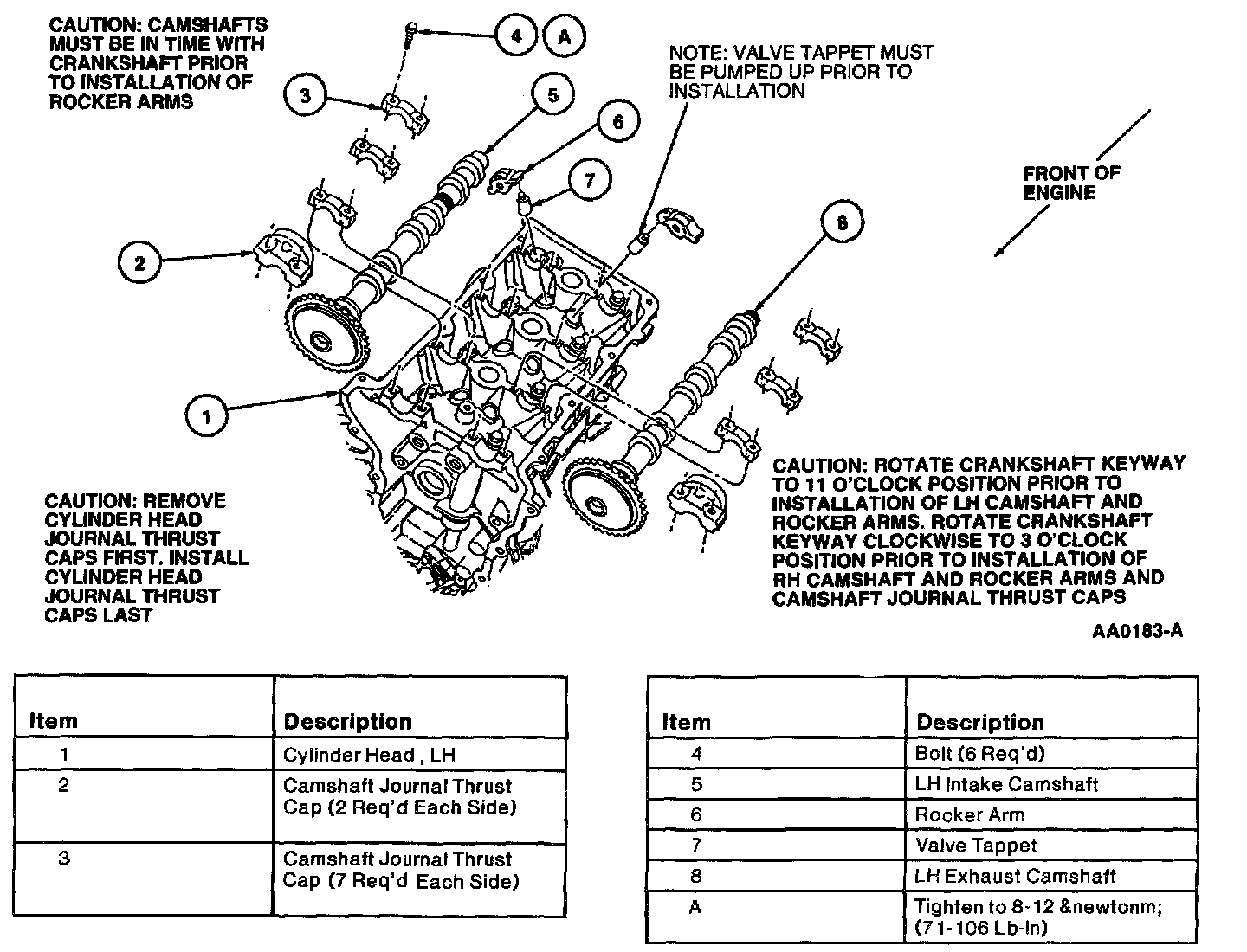 61. With LH cylinder head camshaft journal caps installed and camshaft aligned with the thrust caps, install thrust caps and tighten retaining bolts to 8-12 Nm (71-106 inch lbs.)