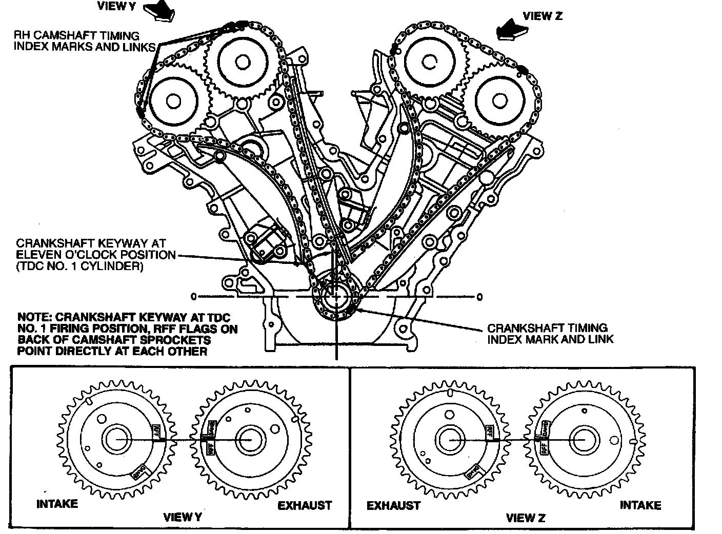 58. Verify timing flags (marked RFF) on camshaft sprockets are pointing toward each other. Verify timing index links on RH timing chain are in alignment with timing index marks on RH crankshaft sprocket and camshaft sprockets.