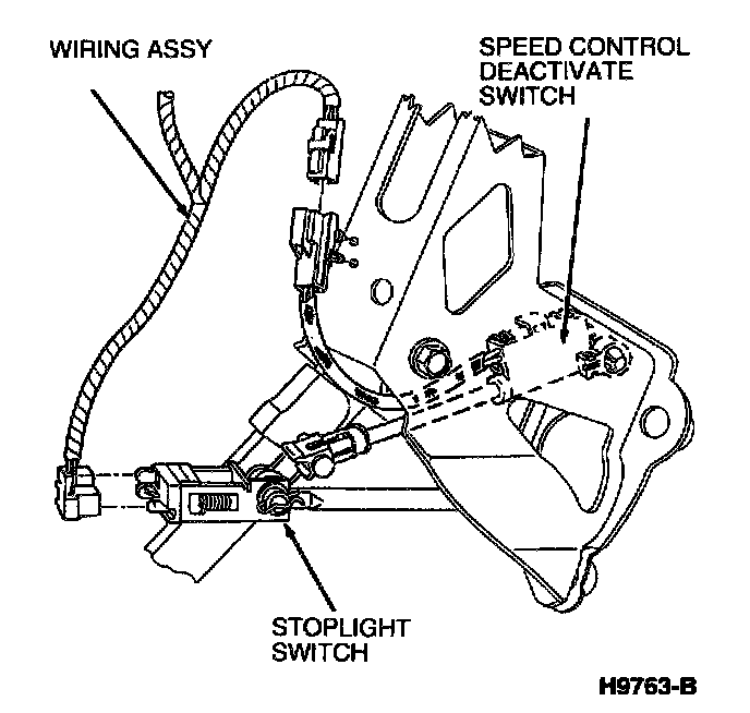 8. Connect wiring harness connector to stoplight switch. Connect wiring harness connector to speed control deactivate switch.
