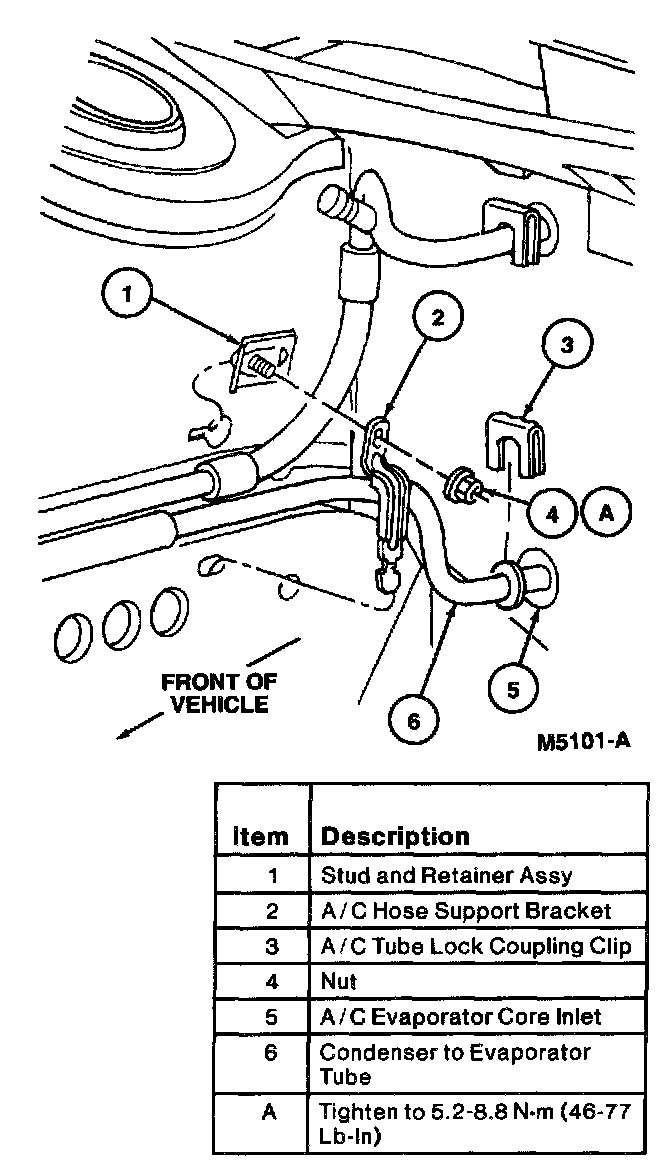 11. Remove retaining screw and condenser to evaporator tube from vehicle.