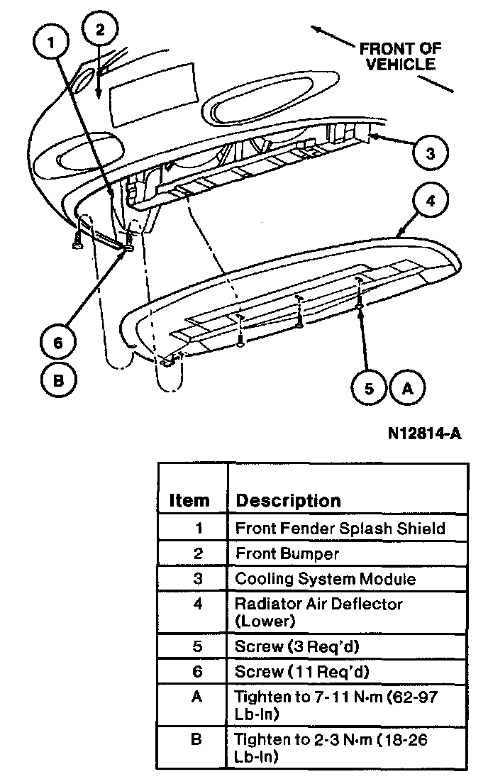9. Install lower radiator air deflector. Tighten three splash shield-to-radiator screws to 7-11 N.m (62-97 Lb-In) and remaining 11 screws to 2-3 N.m (18-26 Lb-In).