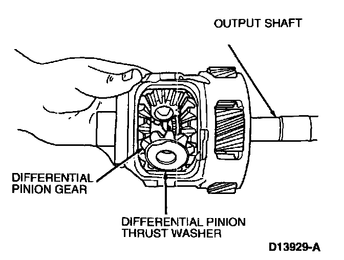 7. Rotate the output shaft to remove two differential pinion gears and two differential pinion thrust washers.