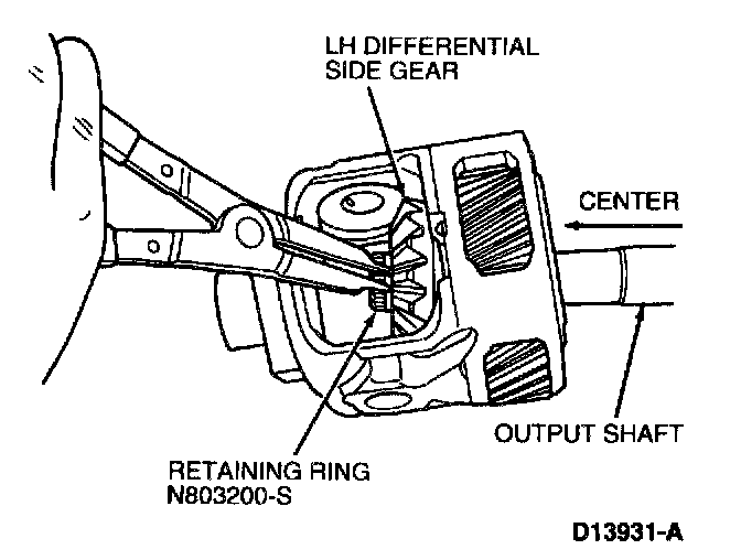 9. Push output shaft towards center of differential housing. Slide LH differential side gear upward to gain access to retaining ring. Use snap ring pliers to remove retaining ring. Remove output shaft.