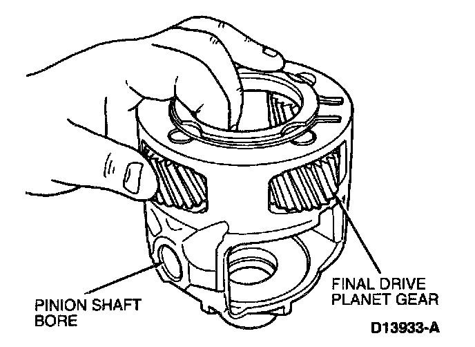 1. Inspect differential pinion and side gears for looseness, discoloration, cracks or excessive gear tooth wear. Inspect four final drive planet gears, two pinion shaft bores and pinion shaft for looseness, discoloration, cracks, excessive gear tooth wear or rotational binding. Service as required.