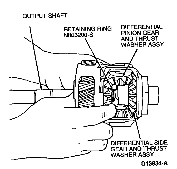 2. If removed, install two differential side gear thrust washers, differential side gears, output shaft and retaining ring. Walk differential pinion gears and differential side gear thrust washers into position by rotating output shaft.