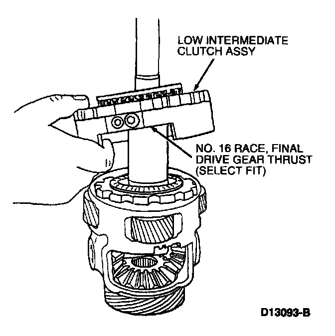 10. Install low intermediate clutch piston and rear planet support with No. 16 race, final drive gear thrust (select fit) onto final drive assembly for reassembly into transaxle.