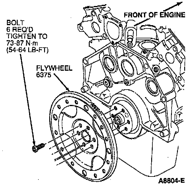Position flywheel on the crankshaft and install retaining bolts. Tighten bolts to 73-87 Nm (54-64 ft. lbs.) using the standard cross-tightening sequence.
