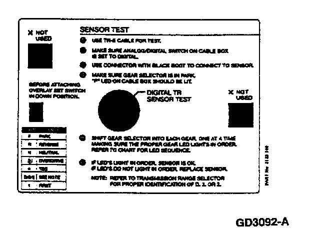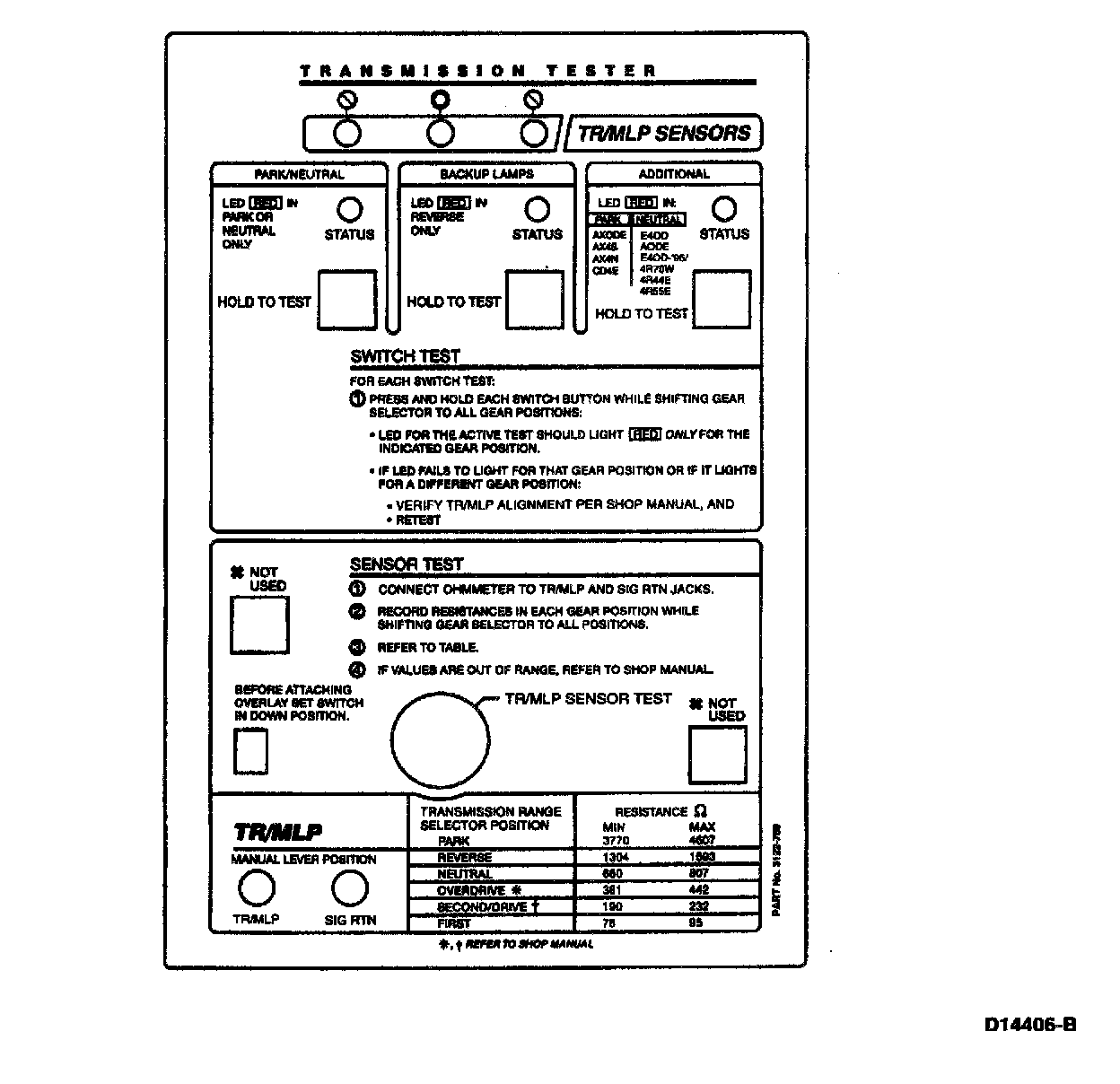 The transmission tester allows you to test the digital TR or analog TR sensors independent of the vehicle electronics. TR sensor testing is divided into five steps: