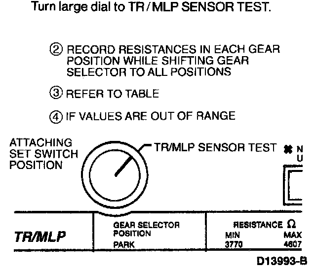 3. Monitor the instrument panel status lights located in the TR sensor E cable. The LED should illuminate red for the appropriate range selected.