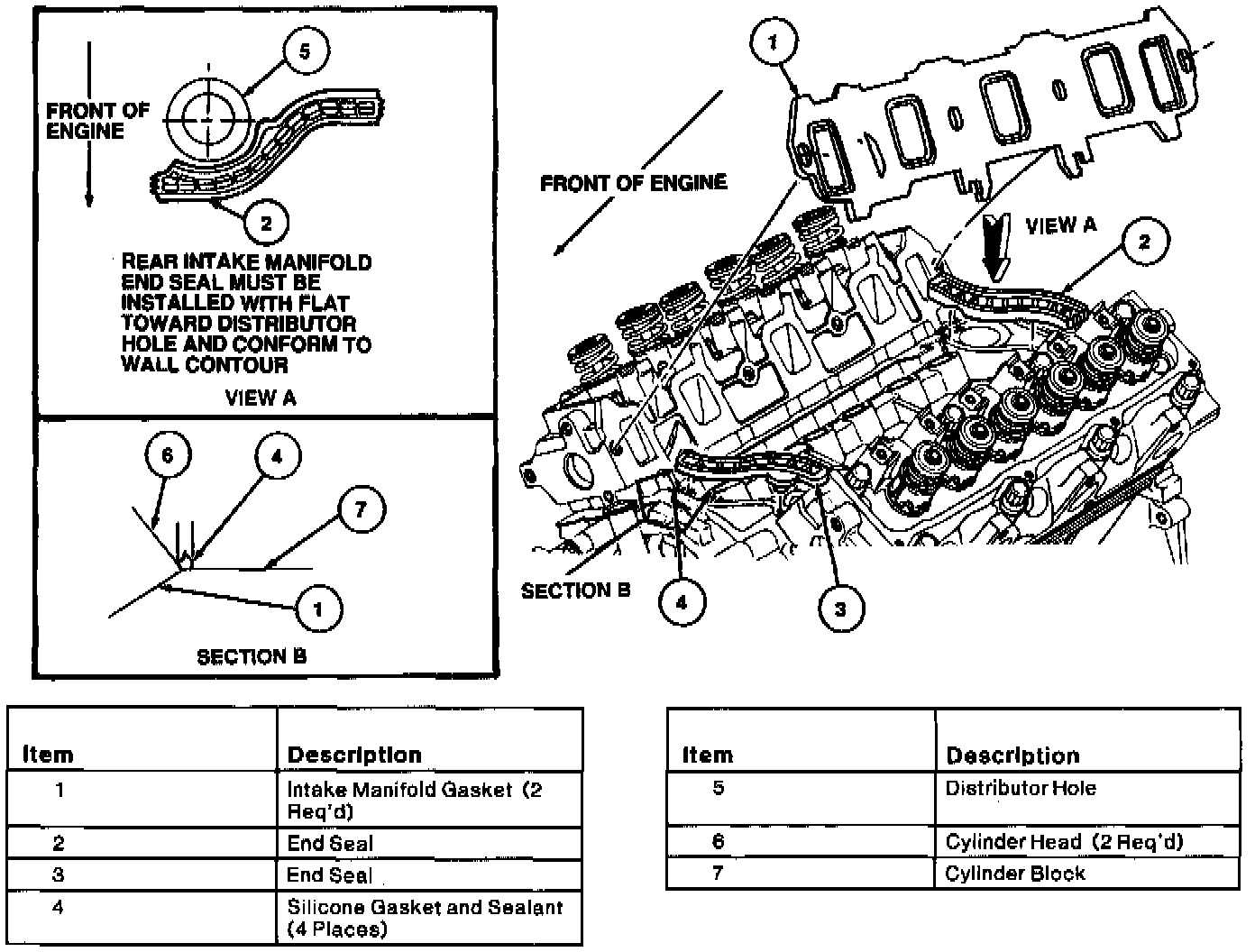 6. Install front and rear intake manifold end seals as shown. Secure with retainers.