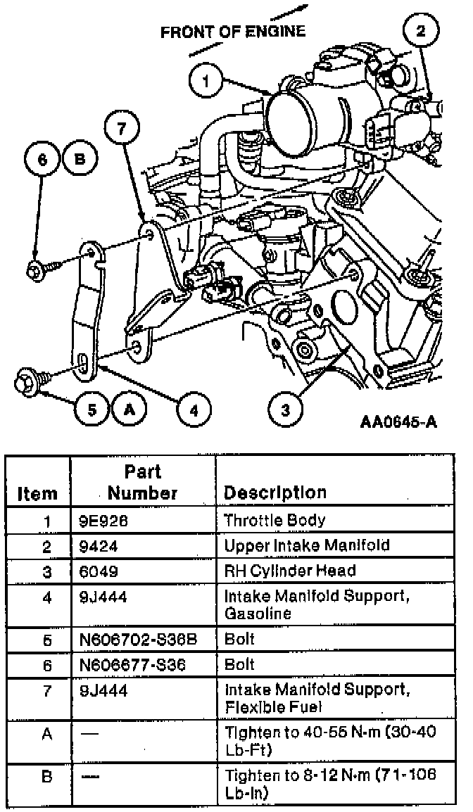 9. Install intake manifold support to the throttle body and RH cylinder head. Tighten retaining bolts as shown in the illustration.