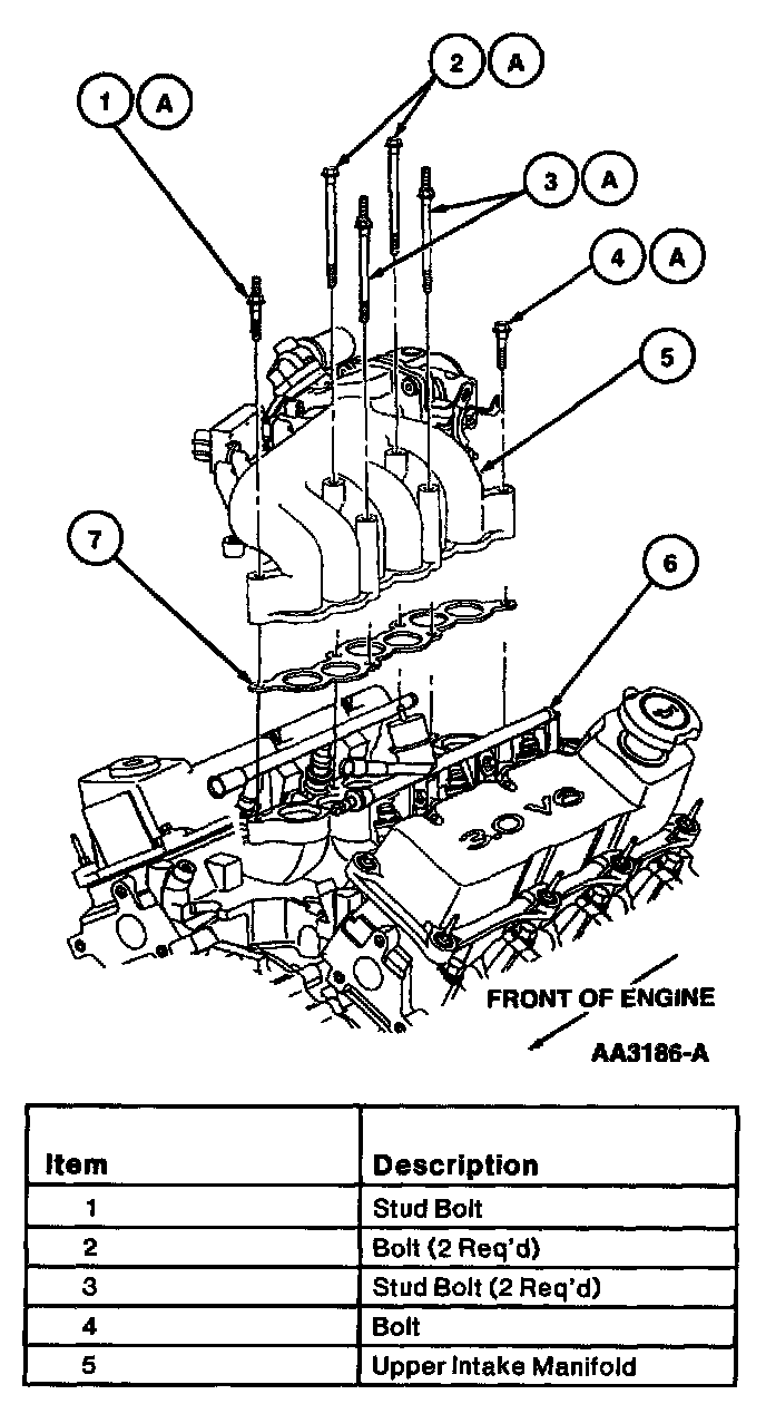 17. Loosen and remove the upper intake manifold retaining bolts and stud bolts (note location for installation).