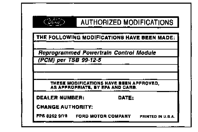 Obtain an Authorized Modifications Decal (FPS 8262 - obtainable through DOES II, 25/pkg) and list the date, dealer number, and summary of modifications performed. Select a prominent place adjacent to the Vehicle Emission Control Information Decal suitable for installing the Authorized Modifications Decal. Clean the area, install the decal, and cover it with a clear plastic decal shield.