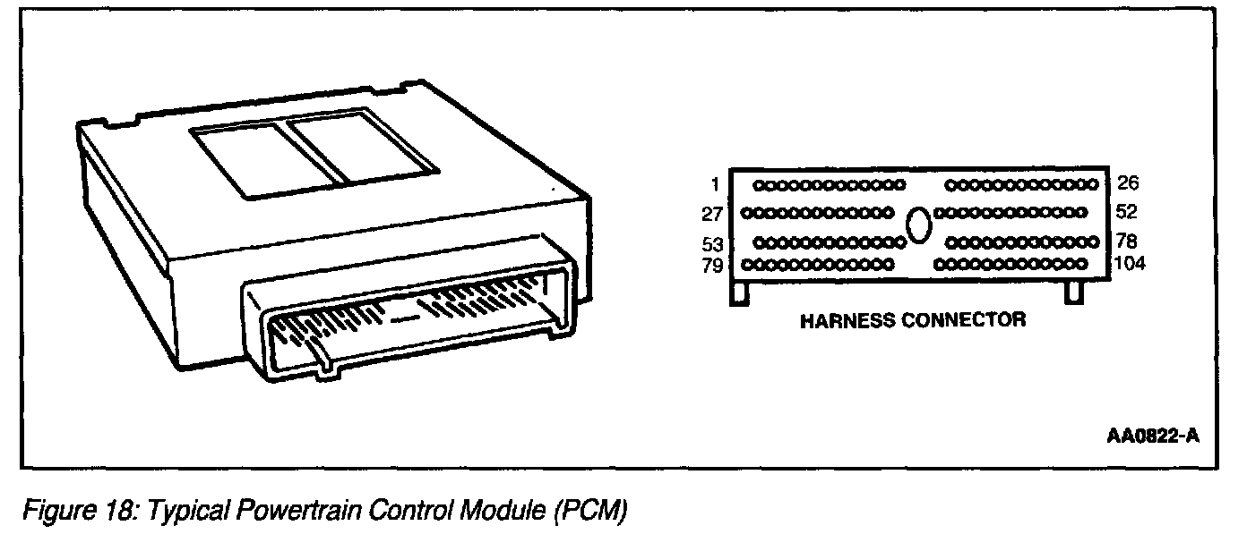 The center of the Electronic EC system is a microprocessor called the powertrain control module. All applications will continue to use the standard 104-pin PCM. The PCM receives input from sensors and other electronic components (switches, relays). Based on information received and programmed into its memory, the PCM generates output signals to control various relays, solenoids and actuators.