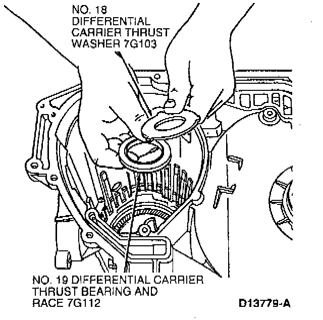 7. Install No. 19 differential carrier thrust bearing and race over case boss with flat side facing up, outer lip facing down. Install No. 18 differential carrier thrust washer (tabs down) over No. 19 differential carrier thrust bearing and race.