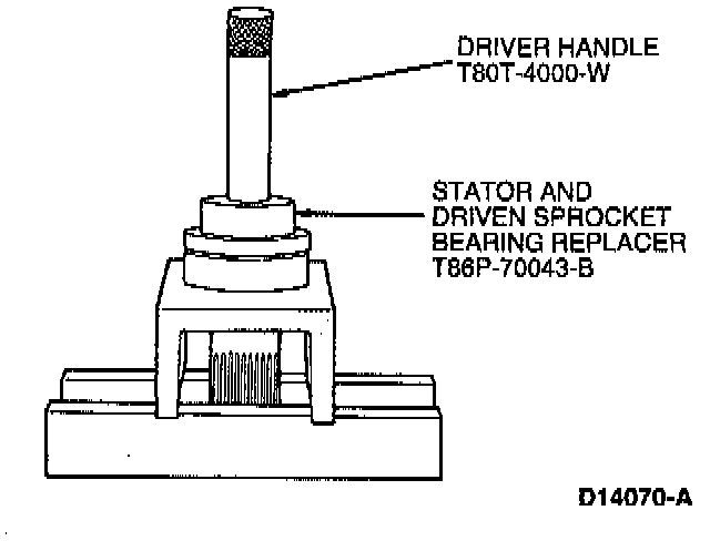 4. If bearing was removed, install new drive sprocket bearing using Stator & Driven Sprocket Bearing Replacer 307-164 (T86P-70043-B) and Driver Handle 205-153 (T80T-4000-W).