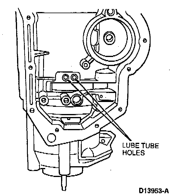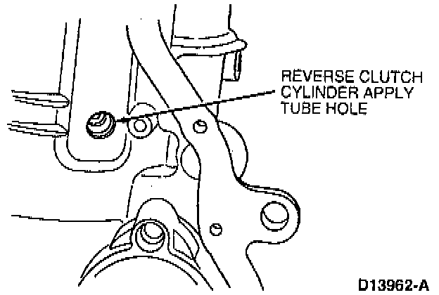 37. Make sure reverse clutch cylinder apply tube hole is aligned with case holes as shown. Remove installation tool.