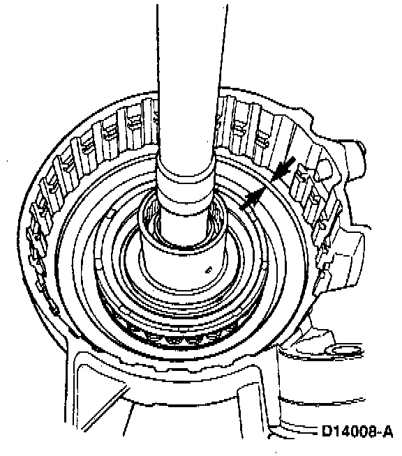 13. Perform the end clearance check for the planetary support. If end clearance is not within specification, replace the selective fit beveled retaining ring to obtain proper clearance.