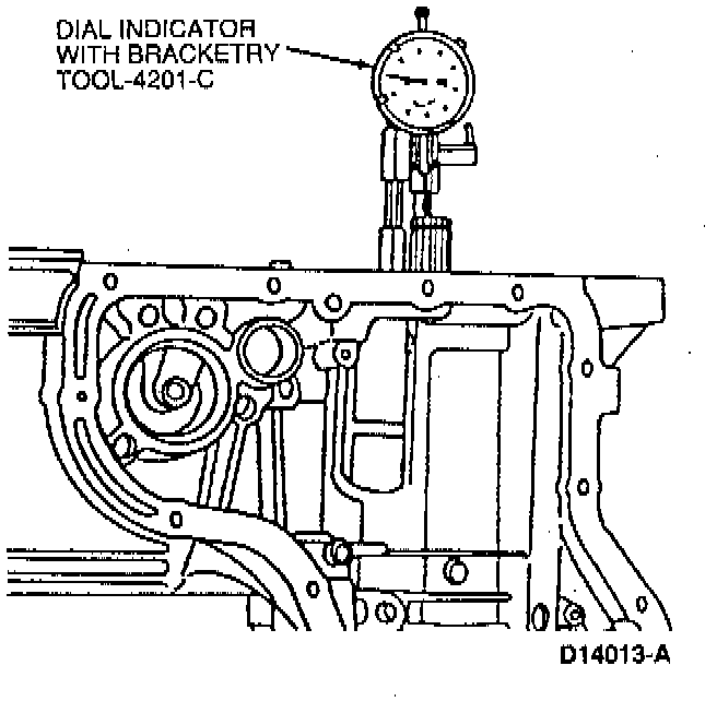 Check for correct selective fit beveled retaining ring. Place Gauge Bar 307-300 (T94P-77000-Q) across case with round legs of gauge bar resting on chain cover gasket surface. Place Dial Indicator Extension Rod 307-320 (T94P-77001-MH) through hole in gauge bar.