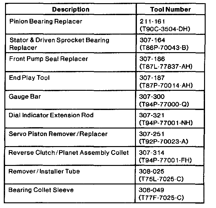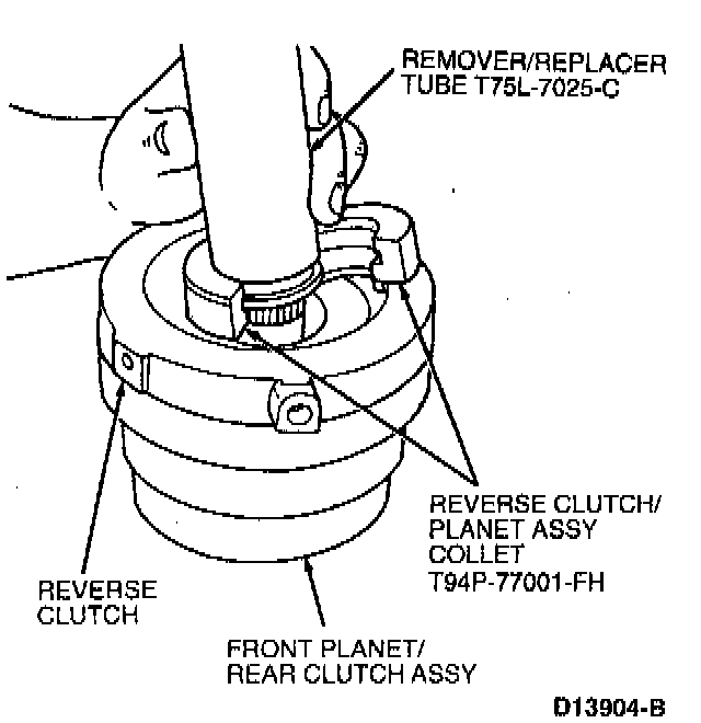 Place two 3/8 inch wasters between the Front Clutch Loading Tool 307171 (T86P-70389-A) handle and notched block Install Front Clutch Loading Tool Screw 307-316 (T94P-77001-HH) into Front Clutch Loading Tool 307-171 (T86P-70389-A). Install fool to forward/intermediate/direct clutch assembly.