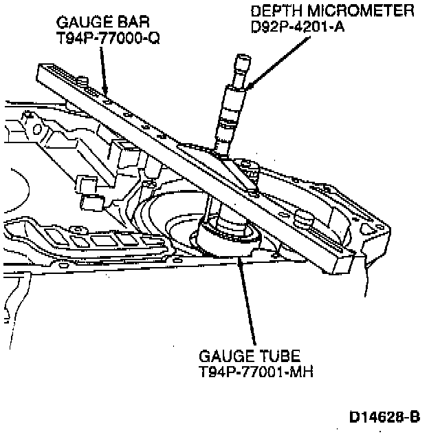 46. Place Gauge Bar 307-300 (T94P-77000-Q) across transaxle case with round legs of gauge bar resting on chain cover gasket surface. Place Depth Micrometer 303-D075 (D92P-4201-A) or equivalent on gauge bar and measure down to gauge tube. Do this on both sides of output shaft (180 degrees apart). Add both readings, divide by two to obtain reading A.