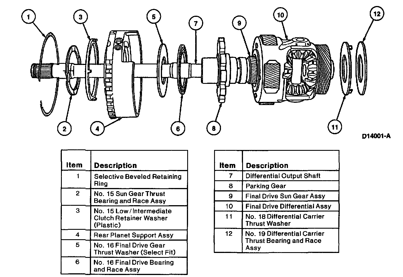23. NOTE: The beveled retaining ring and rear planet support must be removed to change No. 16 thrust race.