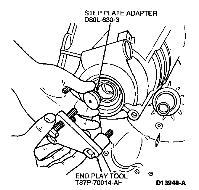16. Install Step Plate Adapter 205-D014 (D80L-630-3) or equivalent and End Play Tool 307-187 (T87P-70014-AH) and two bolts over RH output shaft opening.