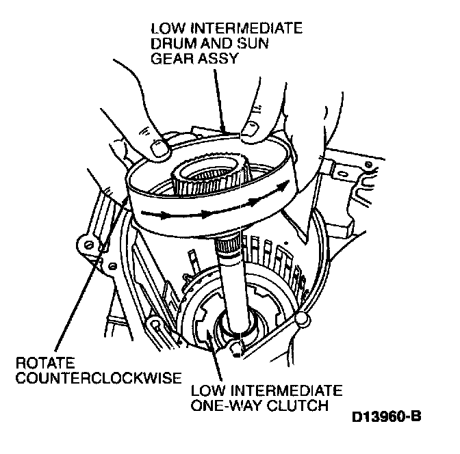32. Install low-intermediate drum. Rotate counterclockwise to seat the race of low-intermediate drum and sun gear into the low-intermediate one-way clutch.
