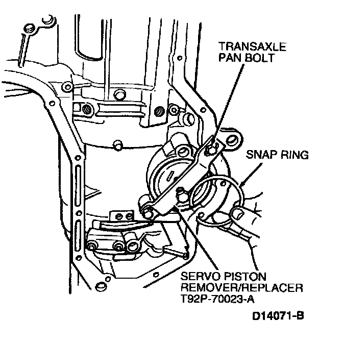 34. Install coast band apply piston spring, piston and rod assembly, cover and retaining ring using Servo Piston Remover/Replacer 307-251 (T92P-70023-A).