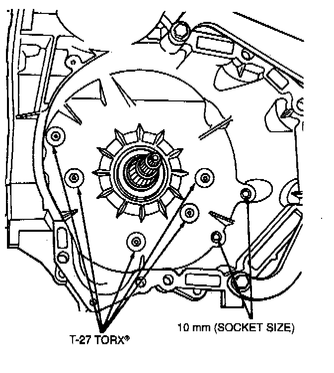 17. Remove five T27 Tort and two chain cover bolts from inside transaxle bell housing.