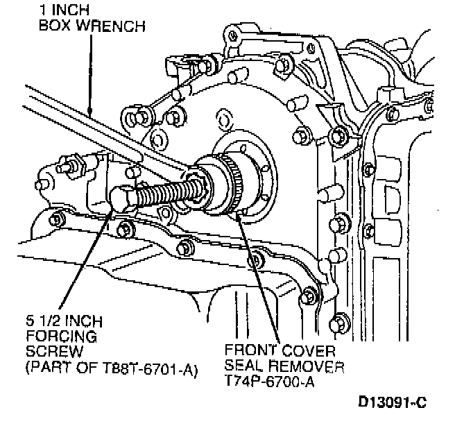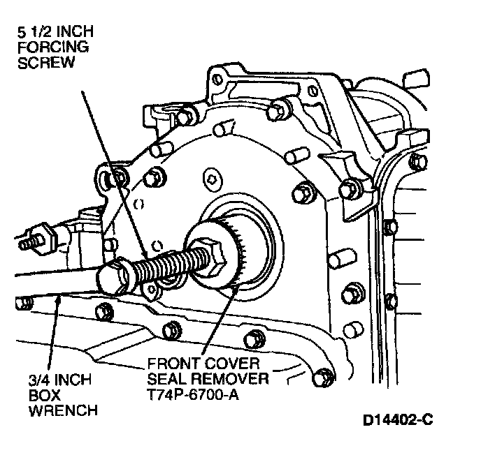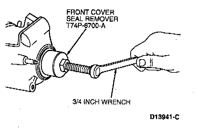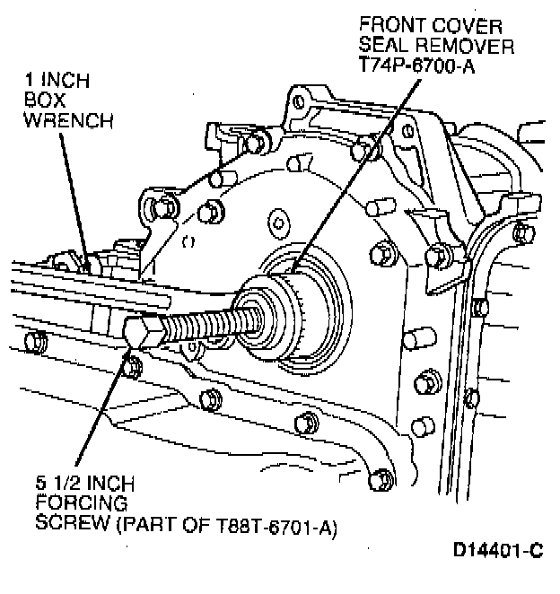 13. Install Front Cover Seal Remover 303-107 (T74P-6700-A) and forcing screw into seal using a one-inch box wrench.