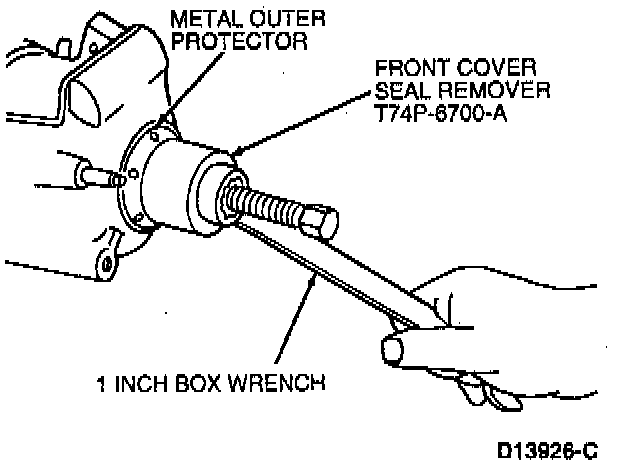 b. Screw Front Cover Seal Remover 303-107 (T74P-6700-A) and 5 1/2-inch forcing screw (from tool kit 303-335 (T88T-6701-A)), into outer metal protector using a one-inch box wrench.