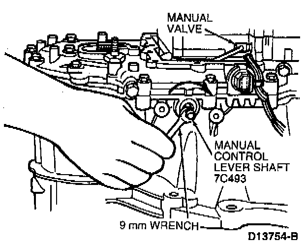 Using a 9 mm wrench on flats of manual control lever shaft, rotate shaft clockwise to manual LOW detent.