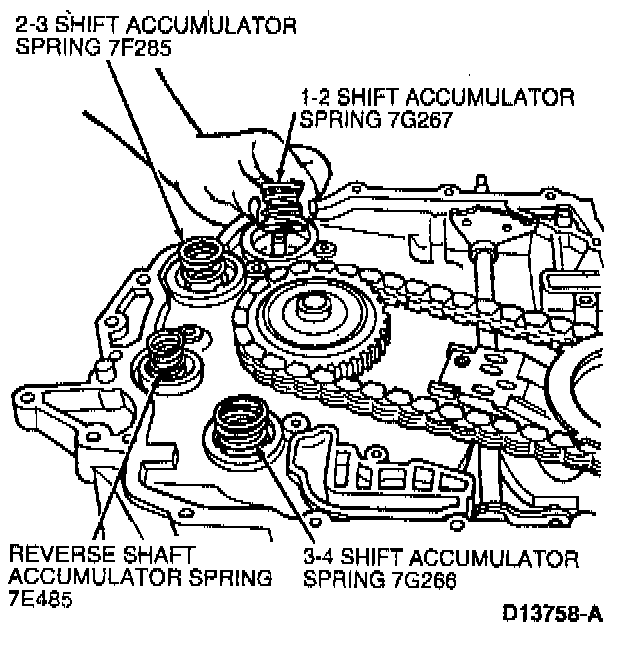 32. NOTE: SHO vehicles are equipped with an additional 1-2 accumulator cushion spring which fits into the center of the 1-2 shift accumulator spring. Make sure to note the position of this additional spring on SHO vehicles along with the remaining four accumulator springs.