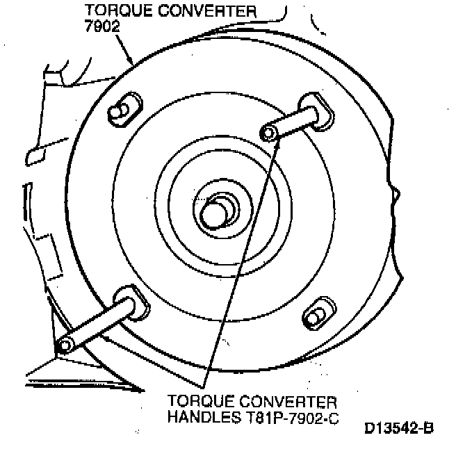 Install Torque Converter Handles 307-091 (T81P-7902-C). Remove torque converter from transaxle. Drain fluid from torque converter.