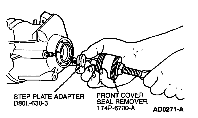 a. Install Step Plate Adapter 205-DS011 (D80L-630-A) or equivalent into output shaft opening. Install Front Cover Seal Remover 303-107 (T74P-6700-A) and 5 1/2-inch forcing screw (from tool 303-335 (T88T-6701-A)) into output shaft opening.