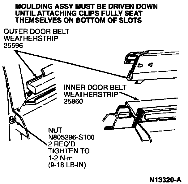 9. Install rear door glass outside weatherstrip by engaging retention clips using hand pressure.
