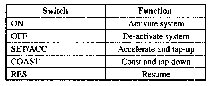 The speed control system is operated by means of five switches on the steering wheel. The functions are: