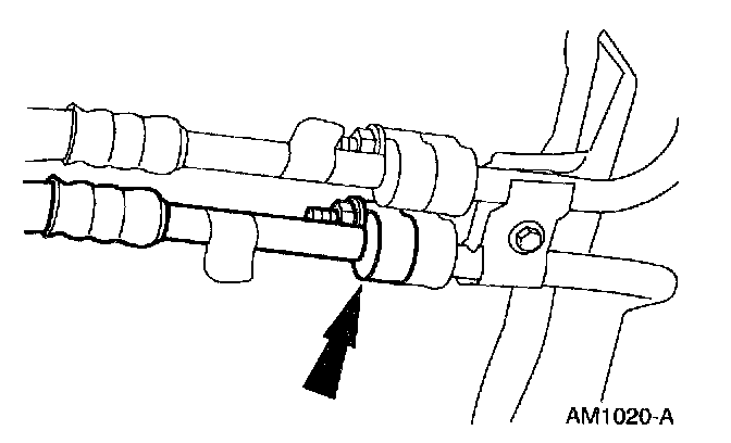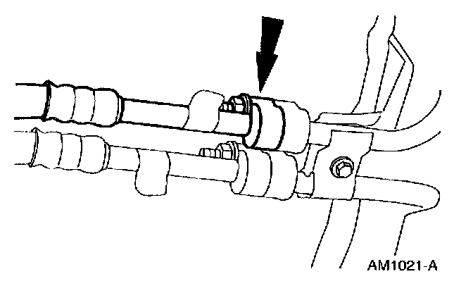5. Disconnect the A/C compressor to condenser discharge line from the A/C condenser core. Refer to the peanut fitting connect and disconnect general procedure. Peanut Fitting Connect and Disconnect Procedure